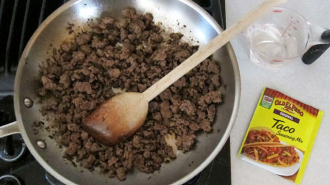 While the bread is baking, make your taco meat according to the Old El Paso™ Seasoning package instructions.