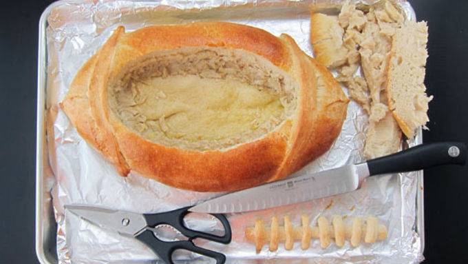 Remove bread bowl from oven. Carefully, cut out the center, making the opening in the bowl larger, leaving about a 2 inch border all the way around the football. Remove the excess bread. Be careful, the bread will be quite hot.