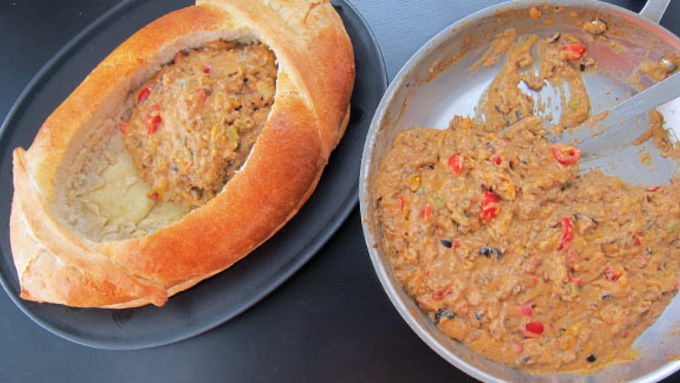 Once your taco meat has simmered and most of the liquid has evaporated, add the refried beans, chiles, tomatoes, olives, cheese, and sour cream. Stir to combine. Heat over low heat, stirring occasionally, until your bread bowl is ready.
