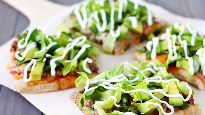 - I’m pretty sure that I could live on tacos. Or pizza. Or egg drop soup. (Ok ok, no soup in this recipe.) But when you combine tacos AND pizza, I’m definitely a happy camper! Especially when the pizza is loaded up with all sorts of delicious salsa, seasoned meat and my kind of “greens.” And, this recipe uses a fabulous whole grain pizza crust that brings it all together in minutes. If you’re not a hamburger person, feel free to substitute chicken or sausage instead. Or you can easily go vegetarian! However you make it, I think you’ll love this simple Taco Pizza. Layer on some “greens” – chopped lettuce, avocado, green onions and fresh cilantro. Pretty! Then drizzle with some sour cream if you’d like. (I just spooned some into a thick Ziplock bag, and snipped off the corner and drizzled away!) And then voila! A delicious taco pizza is ready to go in minutes.