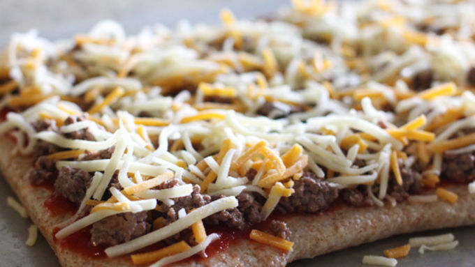 Step3Spread salsa out evenly on top of the pre-baked crust. Top evenly with ground beef, and then shredded cheese. Return pizza to oven for 10-12 minutes, or until cheese is melted.