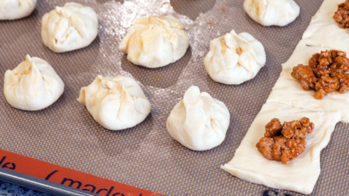 Step3Cut into three long strips, lengthwise, and then in five, to make 15 squares. Spoon a little bit of taco filling on each square. Pinch the edges up, to make a little purse and enclose the filling. Roll quickly between your hands to smooth.