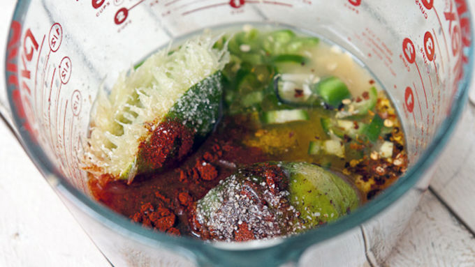 Step1In a medium bowl, mix together lime juice, olive oil, tequila, orange juice, pepper, garlic, honey and spices.