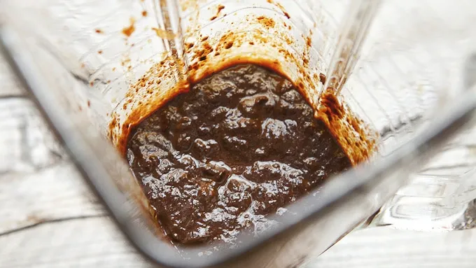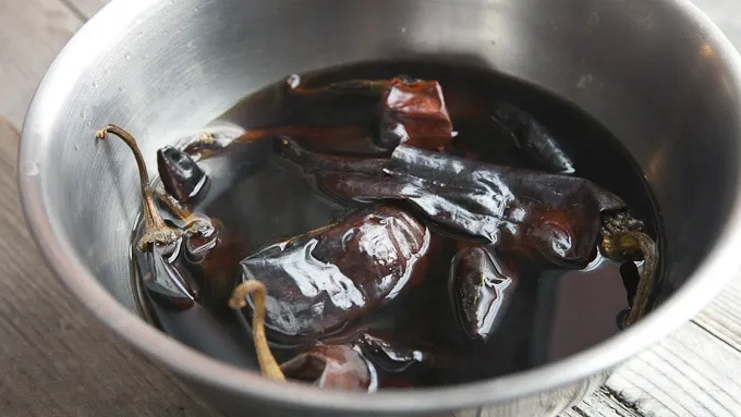 Lay out dried chiles on a baking sheet and roast at 325°F for 8-10 minutes until chiles are fragrant. Add to a bowl and cover chiles with hot water. Let sit for 30 minutes.