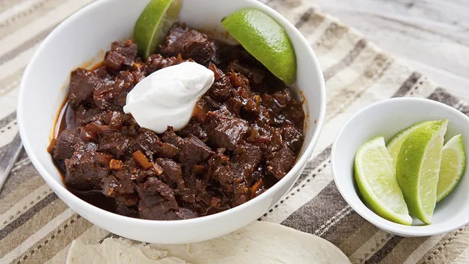 var configuration = {"title":"Texas-Style Beef Brisket Chili","introduction":"Traditional Texas beef chili recipe with no beans and no tomatoes. This is the real deal.","servingSize":"1 Serving","image":{"small":{"media":"(min-width: 0px)","src":"https://mojo.generalmills.com/api/public/content/OZ0NE85wPkKmxZOthp_kxA_webp_base.webp?v=24b6363e\u0026t=e724eca7b3c24a8aaa6e089ed9e611fd"},"medium":{"media":"(min-width: 500px)","src":"https://rms-media-prod.generalmills.com/d04581f8-fb54-420f-87c3-c4d600d70d81.jpg"},"large":{"media":"(min-width: 767px)","src":"https://rms-media-prod.generalmills.com/d04581f8-fb54-420f-87c3-c4d600d70d81.jpg"},"alt":"Texas-Style Beef Brisket Chili"},"contributor":{"label":"by:","name":"Macheesmo","profileUrl":"/contributors/macheesmo","displayDate":{"label":"Updated","date":"Apr 10, 2017"}},"ingredientGroups":[{"ingredients":[{"quantity":"8","description":"dried chiles, New Mexico and/or guajillo"},{"quantity":"2","description":"teaspoons ground cumin"},{"quantity":"1","description":"teaspoon kosher salt"},{"quantity":"1","description":"teaspoon ground black pepper"},{"quantity":"6","description":"tablespoons vegetable oil, divided"},{"quantity":"2","description":"- 2 1/2 lb boneless beef chuck roast, cut into 1/2 to 3/4-inch cubes"},{"quantity":"1/2","description":"yellow onion, diced"},{"quantity":"2","description":"cloves garlic, minced"},{"quantity":"","description":"2-3 cups beef stock"},{"quantity":"2","description":"tablespoons cornmeal"},{"quantity":"1","description":"tablespoon white vinegar"},{"quantity":"1","description":"tablespoon brown sugar"},{"quantity":"","description":"Sour cream, for garnish"},{"quantity":"","description":"Lime wedges, for garnish"},{"quantity":"","description":"Tortilla chips, for garnish"}]}],"steps":[{"description":"Lay out dried chiles on a baking sheet and roast at 325°F for 8-10 minutes until chiles are fragrant. Add to a bowl and cover chiles with hot water. Let sit for 30 minutes.","stepShotImageUrl":"//mojo.generalmills.com/api/public/content/Allz7yNO_Emw1xuDXId0aQ_webp_base.webp?v=9990cd6d\u0026t=3653fe2f5ecd4a47a5a51c97e429947c"},{"description":"Drain chiles (reserve the soaking water) and cut off stems. Remove seeds and roughly chop the chiles. Add to a blender with the cumin, salt, and pepper. Pour in about 1/2 cup of the reserved soaking water and blend until the mixture is in a smooth paste. You might need to add a bit more water if it is too thick.","stepShotImageUrl":"//mojo.generalmills.com/api/public/content/scsT2MiwUEO-BFFfvNv04w_webp_base.webp?v=8742cb17\u0026t=3653fe2f5ecd4a47a5a51c97e429947c"},{"description":"Season beef cubes with big pinches of salt and pepper.","stepShotImageUrl":"//mojo.generalmills.com/api/public/content/zntjyd1w-UOz95TBlaY_Dg_webp_base.webp?v=cba74e19\u0026t=3653fe2f5ecd4a47a5a51c97e429947c"},{"description":"Place a large Dutch oven over medium-high heat. Add 3 tablespoons vegetable oil and brown beef in 2 batches until it\u0027s browned on all sides, 8-10 minutes per batch. Remove beef and set aside.","stepShotImageUrl":"//mojo.generalmills.com/api/public/content/wssQiMc6Z0GdJ-eNE6HOmA_webp_base.webp?v=17035adf\u0026t=3653fe2f5ecd4a47a5a51c97e429947c"},{"description":"Add remaining vegetable oil to pot and add onions. Turn heat down to medium and as onions sweat, scrape up bits stuck to the pan. After onions cook for 3-4 minutes, add garlic and cook for another minute.","stepShotImageUrl":"//mojo.generalmills.com/api/public/content/irv3r1yW3E-eGPatasSQ7g_webp_base.webp?v=95dd7652\u0026t=3653fe2f5ecd4a47a5a51c97e429947c"},{"description":"When onions and garlic are soft, add beef stock (start with 2 cups) along with 1 cup of reserved chile water and 1 cup of regular water. Use liquid to again scrape up any bits on the pan.","stepShotImageUrl":"//mojo.generalmills.com/api/public/content/_VlE4veY7U60qv4m77wqQw_webp_base.webp?v=79ff8244\u0026t=3653fe2f5ecd4a47a5a51c97e429947c"},{"description":"Add beef back to pot with any liquid that has settled, plus the chile paste and cornmeal. Bring chili to a simmer and turn heat down to low so the mixture is barely bubbling. Cover and let simmer on low heat for 90 minutes.","stepShotImageUrl":"//mojo.generalmills.com/api/public/content/jOUyQEW1tEuy8qCU4b6vYQ_webp_base.webp?v=7e5dd989\u0026t=3653fe2f5ecd4a47a5a51c97e429947c"},{"description":"Add vinegar and brown sugar to the pot, remove from heat, and let sit for 30 minutes so the beef can absorb the juices. Then gently reheat chili over low heat, adding more stock if the chili is too thick."},{"description":"Adjust flavors to your liking by adding more salt or pepper."},{"description":"Serve chili in bowls garnished with sour cream, lime wedges and corn tortillas or tortilla chips.","stepShotImageUrl":"//mojo.generalmills.com/api/public/content/UNS2FRJ-rU-OgqONUb2A_w_webp_base.webp?v=e444dea0\u0026t=3653fe2f5ecd4a47a5a51c97e429947c"}],"tips":[{"title":"","description":"Big beefy chunks make this chili some of the heartiest around. But don\u0027t look for beans in there! Beanless beef chili – the real deal!\r\n\r\nBeans or no beans? Tomatoes or no tomatoes? These are the first questions most people ask when they ask about chili. If you ask these questions to a Texan, they will almost certainly say no to both!\r\n\r\nIn fact, some will get mad at the idea of calling something chili if it has beans or tomatoes. It’s not the real thing that way, they\u0027ll say.\r\n\r\nTo be honest, I tend to be a bit more flexible in my chili definitions, but for those diehard chili fans, this is how you make an official bowl of beef chili, or \u0022Texas Red\u0022.\r\n\r\nThe key to any good chili is good chile peppers. Don’t use chili powder! You need the real deal, so get some dried ones (with mild to medium spice). \r\n\r\nOkay. Let’s talk beef. To be honest, you could use a wide range of cuts here. Sirloin, chuck roast or brisket would work just fine. You really want about a half pound of beef per s
