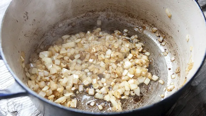 Add remaining vegetable oil to pot and add onions. Turn heat down to medium and as onions sweat, scrape up bits stuck to the pan. After onions cook for 3-4 minutes, add garlic and cook for another minute.