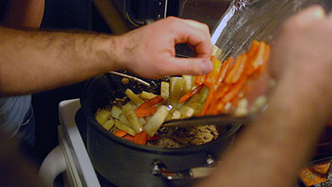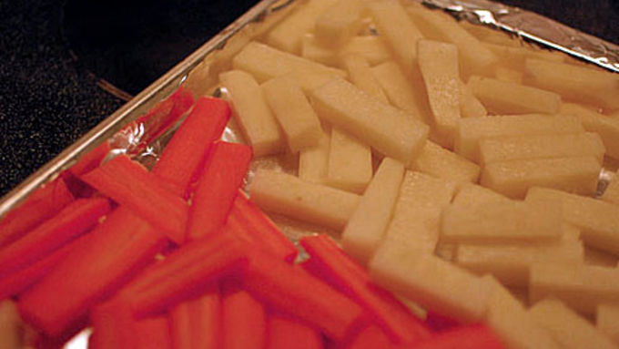 Step1Chop the carrots and potatoes into thick matchsticks. Roast at 450°F until tender.