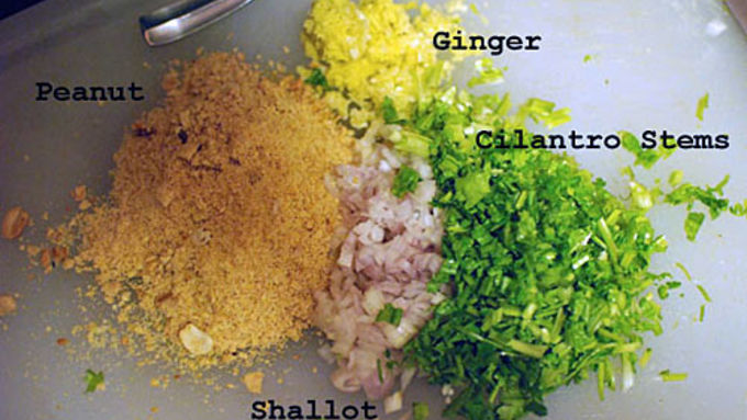 Step2In a food processor or blender, make a paste out of the shallots, ginger, garlic, cilantro stems, red pepper flakes, garam masala, and 3/4 cups of the peanuts. You probably want to start the peanuts in the blender first to break them down before adding the rest of the ingredients.