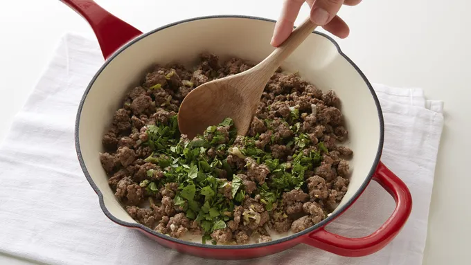Heat 10-inch skillet over medium-high heat. Add beef, white parts of onions, garlic and gingerroot; cook 5 to 7 minutes, stirring to break into pieces, until no longer pink. Drain; to beef mixture in skillet, stir in 2 tablespoons chopped mint, 2 tablespoons chopped cilantro, 1 tablespoon of the lime juice and 1 tablespoon of the soy sauce. Set aside.