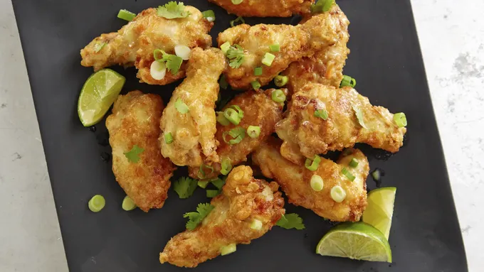 Meanwhile, in medium bowl, mix 1/4 cup lime juice, 3 tablespoons fish sauce, the red curry paste, brown sugar, gingerroot, garlic and pepper flakes. Add chicken; toss to coat. Cover and refrigerate chicken 30 to 60 minutes to marinate.