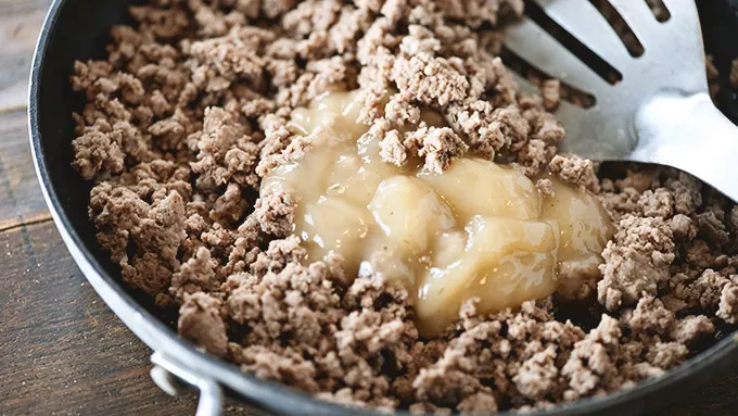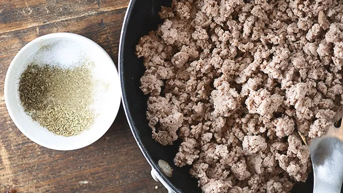 Step3Sprinkle the cooked meat with the sage, thyme, rosemary, salt, and pepper. Pour in 1/4 cup of the gravy and stir to coat the meat well.