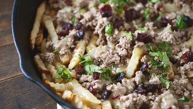 - Thanksgiving dinner and poutine combine to make the ultimate comfort food feast! Turkey, dried cranberries, and rich gravy are the perfect topper for crispy French fries. I served my kids lunch the other day and my youngest asked if it was Thanksgiving. Um, no. But it sure tasted like it! I made a special poutine that’s basically Thanksgiving dinner served over French fries. If that isn’t the best turkey dinner ever, I don’t know what is. I mean, I’m not the type of person that is going to make a full-on Thanksgiving dinner more than once a year, because I'm lazy. That doesn’t mean that I don’t crave those dinners, though! This recipe is a ridiculously easy way to handle those Turkey Day cravings. Add any of your favorite Thanksgiving veggies to this dish to dress it up. Corn, peas, and green beans would all make great toppings. You guys. This is Thanksgiving in one bite right here.