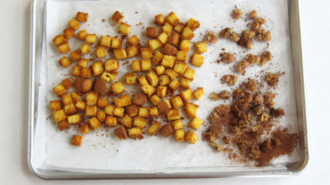 Step11Cut some of the cake scraps into small 1/2 inch cubes. Place in a single layer on a baking sheet and bake in a 350°F oven for 12-14 minutes until golden brown and nicely toasted. Crumble all the remaining cake scraps into a bowl. Add a few spoonfuls of vanilla frosting and mix until the cake all holds together in a ball, adding more frosting as needed. To make the turkey stuffing, break off small jagged looking pieces of the cake/frosting mixture and dust them with cocoa powder to look like "sausage". Toss together with the toasted cake cubes. Set aside.