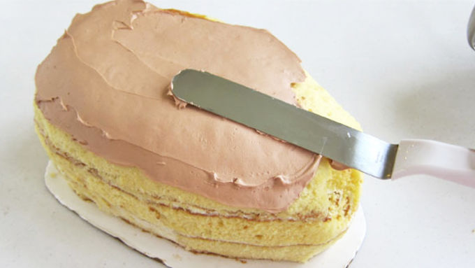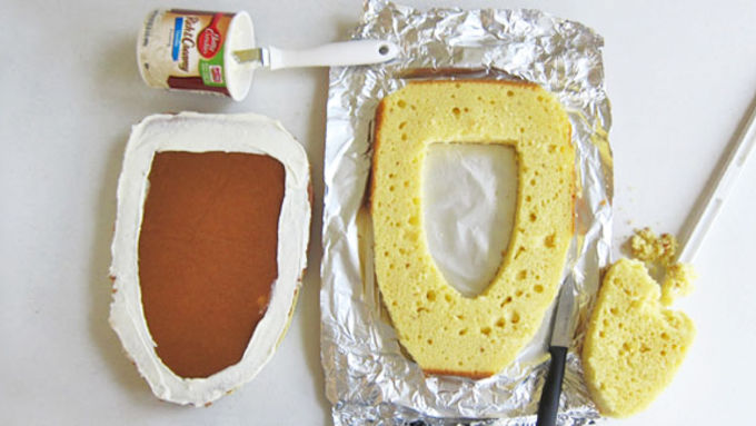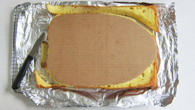 Step3Cut a cake board into the shape of a roasted turkey. Use it as a guide to cut all three cakes into a turkey shape. Freeze cakes for at least 3 hours, to make them easier to handle. Note: At first, I didnt do this, and broke a cake trying to layer them. Dont skip this step!