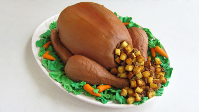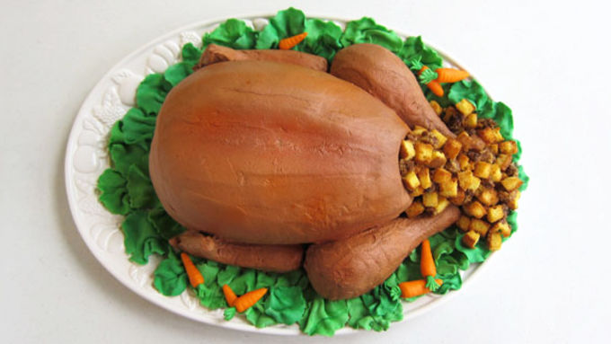 Step17Add the stuffing to the turkey, filling the cavity and allowing it to spill out onto the platter. If you made fondant lettuce and carrots, arrange them around the turkey on platter.