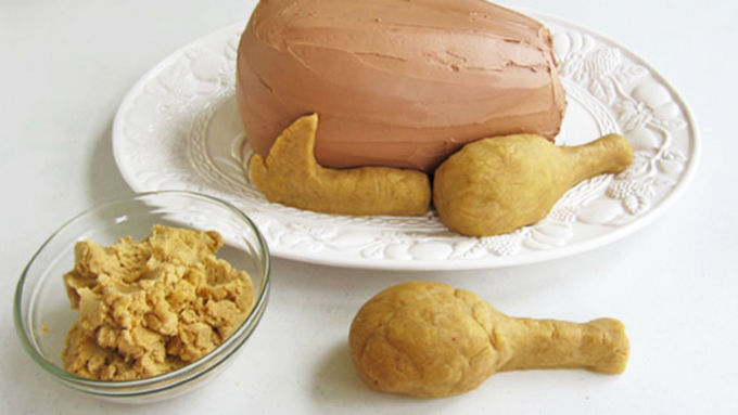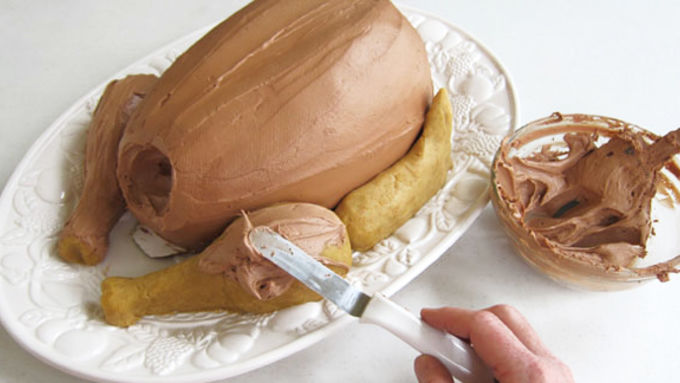 Step12Set the turkey cake on a platter or in a roasting pan. Use the remaining cake/frosting mixture to sculpt two large turkey legs and two wings. Attach them to the cake.
