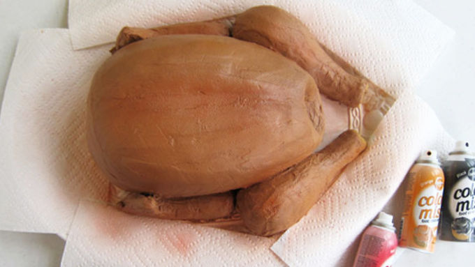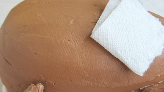 Step14Once the frosting has dried to the touch, press a paper towel that is imprinted with dots, all over the cake to make it look like realistic turkey skin. If the frosting sticks, allow it to dry longer.