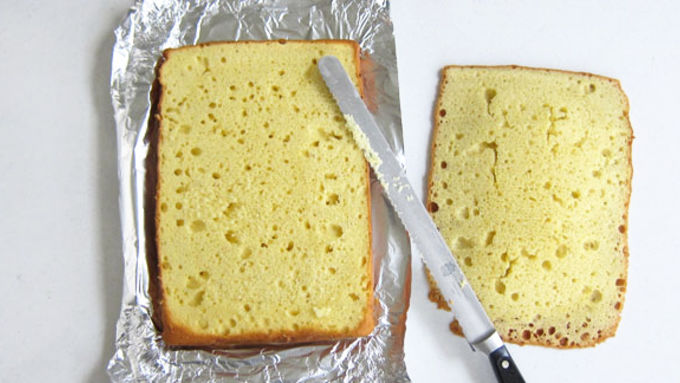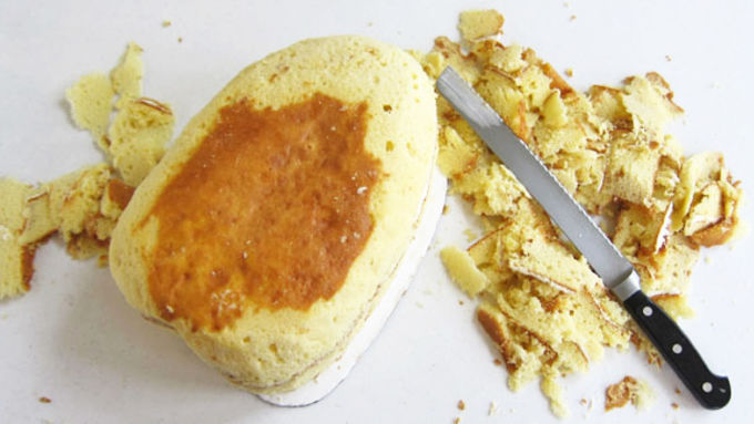 Step2Cut the rounded part of the top of each cake off, leveling each into a nice even thickness. As you work, you need to reserve all your cake scraps. These particular scraps will work nicely to make the cubes for the stuffing.
