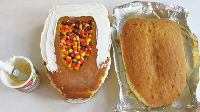 Step5Fill the well in the second cake with candy corn, or any other candy youd like. Frost around the edge of that cake, making sure you dont get the frosting really close to the candy well.
