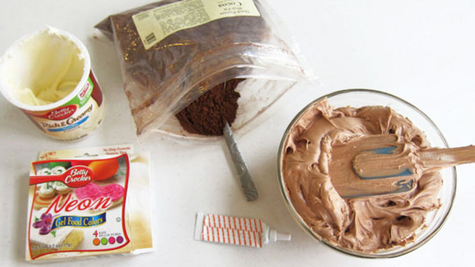 Step8Pour three tubs of Betty Crocker™ Rich & Creamy vanilla frosting into a mixing bowl. Stir in 1/4 cup cocoa powder and some Betty Crocker™ orange gel food color. Add more of each until you get the desired shade for your frosting.
