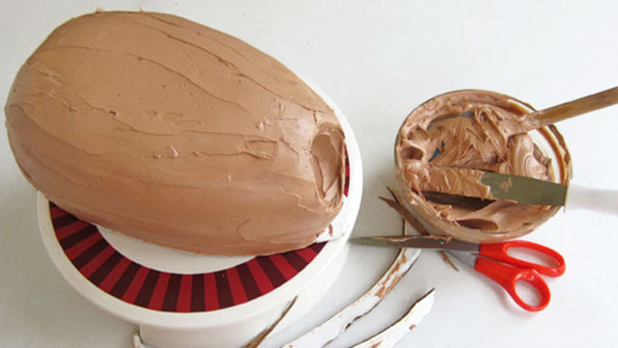 Step9Frost a thin layer over entire turkey cake. This is not your final coat of frosting, its just to hold in all of the crumbs. Let the cake sit at room temperature for 30 minutes so the crumb coat dries a bit.