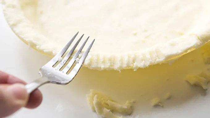 Step3Place dough on top of a large piece of parchment. Cover with a second piece of parchment. Roll out until 1/4-inch thick. Transfer into a 9” pie plate. Cut extra edges with a sharp knife, add a decorative touch by pressing edges with a fork.