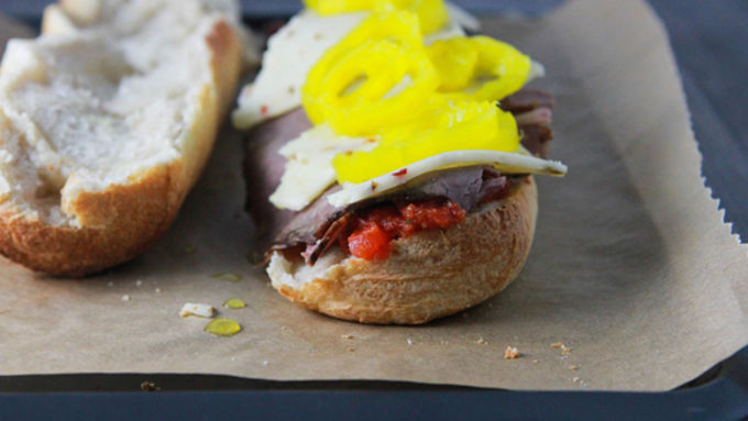 Step2Spread salsa all over the bottom of the bread. Top with roast beef, cheese, and banana peppers.