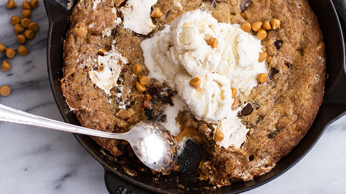 - This skillet cookie is so sweet and so wonderful, it's almost impossible to describe in a single sentence! There are honestly no words for this luscious skillet cookie. Um... other than "to die for". It’s filled will all kinds of sinful ingredients, and yes – it is worth EVERY calorie. You get to eat this warm chewy cookie with ice cream and a drizzle of honey. Seriously, nothing could be better on a cold winter day than a warm and GIANT cookie hot out of the oven. It’s filled with caramel, butterscotch and three kinds of chocolate. Oh, and marshmallow fluff. It’s a little bit of everything! Serve warm with a scoop of ice cream and a drizzle of honey. Then DIG IN!