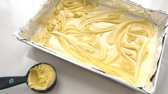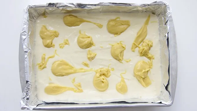 Step5Use a knife to swirl the lemon curd and the cheesecake filling, creating streaks of white and yellow. Break off small pieces of the reserved cake batter mixture and sprinkle them over top of the filling.