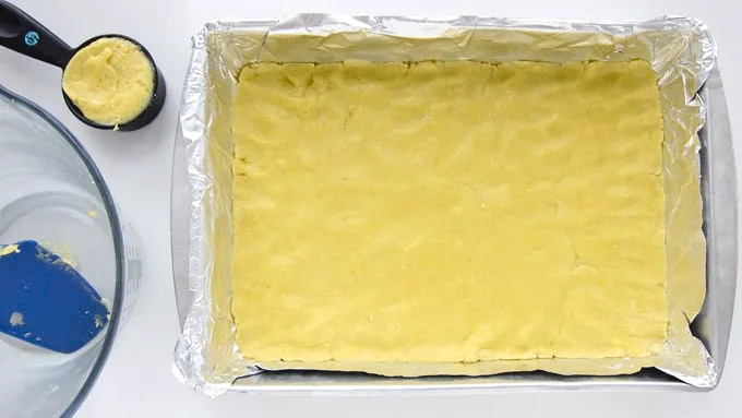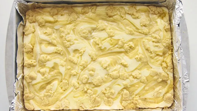 Step2Break remaining cake batter mixture into pieces and scatter them across the bottom of the pan. Press dough pieces down and together into an even layer to form the base of the bars.