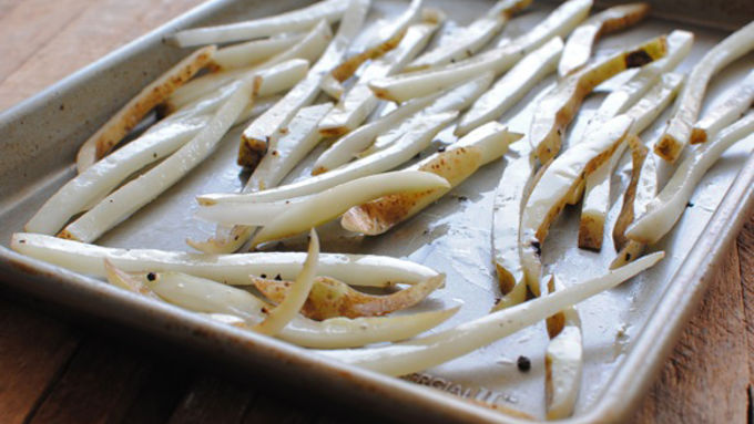 Step2Dry out the bowl, and toss the fries back into it. Toss with the olive oil and a good pinch of salt and pepper. Arrange on a baking sheet and slide into a 475°F oven. Bake for 15 minutes. Flip them and bake another 15 minutes. Based on your oven you might need a little more time.