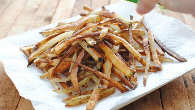 Step3Remove from oven and place on a paper towel-lined plate. Lightly dash the fries with the truffle oil, and another good pinch of salt.