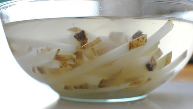 Step1Place the thinly sliced potatoes in a large bowl of cold water. Let sit for two hours. After 2 hours, rinse the potatoes a few more times to get most of the starches out. Pat them dry really well.