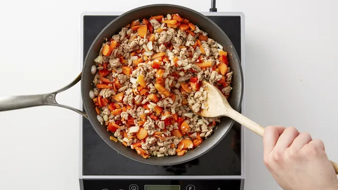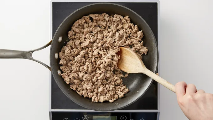 Step1Heat a skillet over medium-high heat. Add turkey to the pan and cook, breaking up with a wooden spoon until browned, about 6 minutes. Season with salt and pepper.