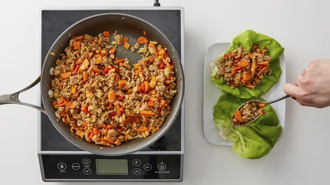 Step3Spoon the turkey mixture into each lettuce cup. Garnish with scallions and drizzle each with a dash of soy sauce. Serve immediately.