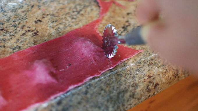 Step3Make the ravioli: Roll out your dough in your pasta roller, at first folding over many times on the widest setting to knead, then slowly making it thinner until it is on the thinnest setting. Roll out a sheet and place it on the work space. Place about a tablespoon or less of filling onto the pasta sheet every 2 inches. With a wet finger, dampen the area around the filling. Top with another piece of rolled out dough and seal around the filling. With a ravioli cutter, cut into heart shapes.