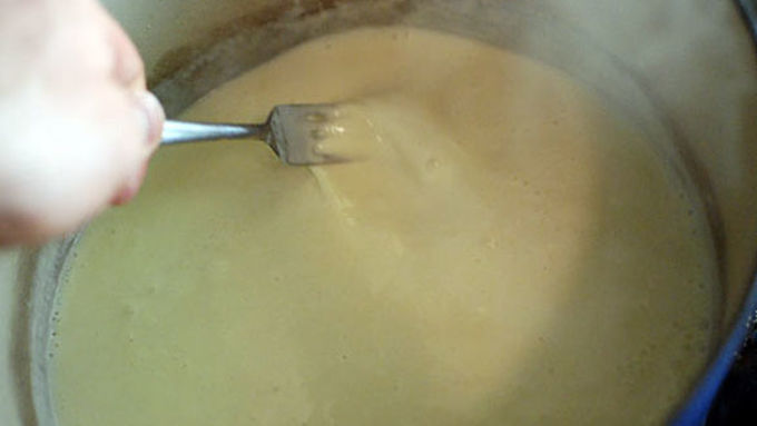 Step5Make the sauce: Cook the oil and flour on medium high, whisking often until it smells nutty and is lightly browned. Add the cream, whisking often. Bring to just a simmer and the mixture will thicken. Remove from heat and allow to cool slightly before stirring in the cheese.