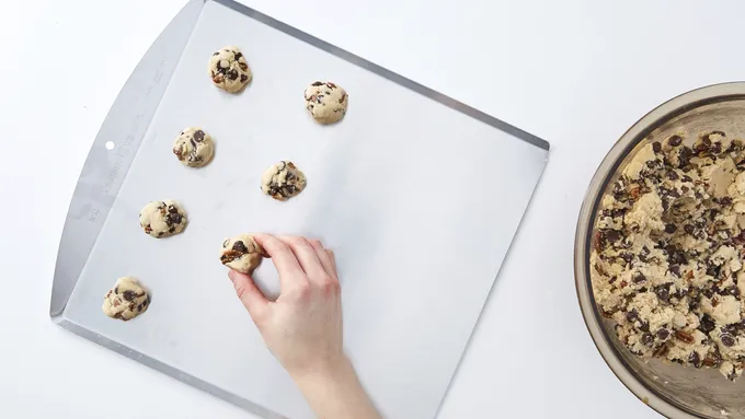 Step2Stir in pecans and chocolate chips until well blended. Drop by rounded tablespoonfuls 2 inches apart on ungreased cookie sheets.