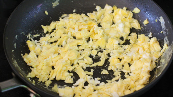 Step2While the vegetables cook, scramble the eggs in a frying pan, making sure to break the egg up into small pieces.