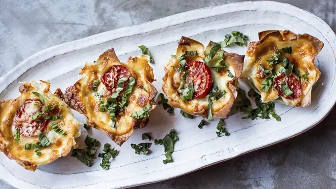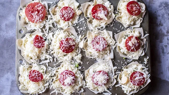 Step2Repeat with two more layers (i.e. wonton, Alfredo, veggies, basil and Parmesan). Finish the cupcakes with a layer of mozzarella cheese, the cherry tomatoes and then a sprinkle of Parmesan. Drizzle each cupcake with a little olive oil and a sprinkle of salt and pepper.