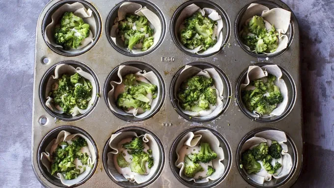 Step1Preheat oven to 375°F. Spray muffin tin with cooking spray. Press 1 wonton wrapper into bottom of each muffin tin. Add a rounded tablespoon of Alfredo sauce to bottom of each muffin tin. Top with a little broccoli, basil and then Parmesan cheese.