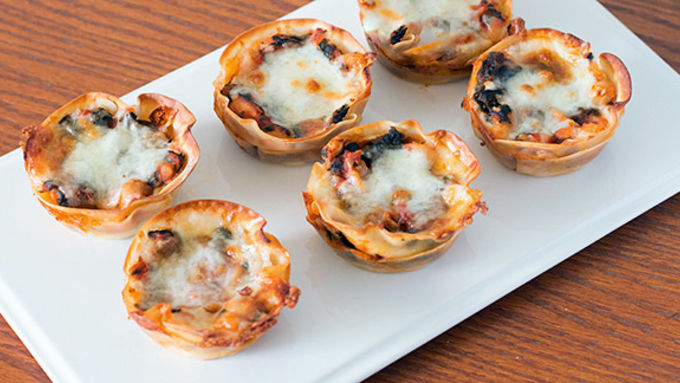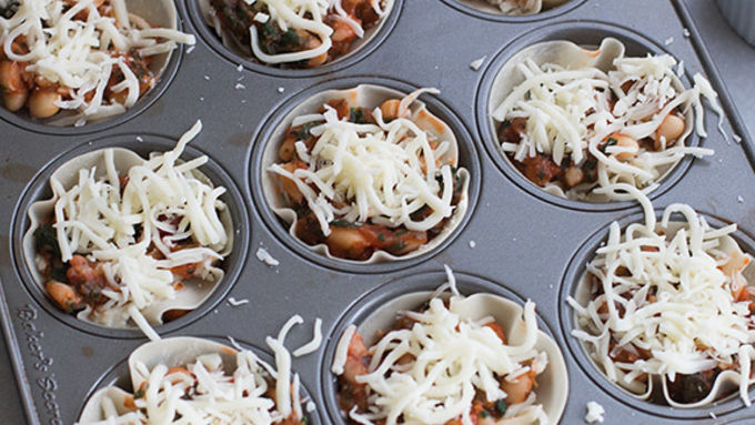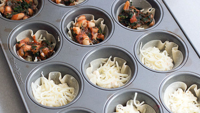 Wonton wrappers, tofu ricotta, mozzarella cheese, tomato sauce, spinach, and cannellini beans are made into delicious vegetarian-friendly cupcakes.
