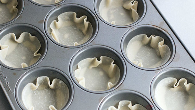 Step4Lightly grease a cupcake pan and press a wonton wrapper into each section.