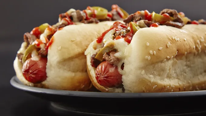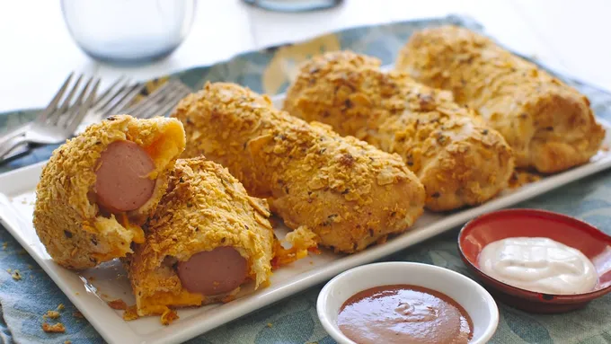 Step3Grill or cook sausages or hot dogs and toast buns. Coat one side of bun with ketchup mixture and the other with mustard mixture. Place cooked sausage or hot dog on bun and top with crushed chips and additional condiments, if desired. Finally, top with cilantro and pickled jalapenos.