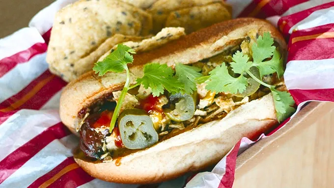 - Topped with chips, sriracha honey ketchup, jalapeño mustard and cilantro, these Asian fusion hot dogs are a spicy street food-style treat. As a food blogger, I love visiting New York City. There’s so much inspiration to be found, and you don’t even have to visit a fancy restaurant to discover it. Street food might be one of my most favorite things ever, and these days you can get gourmet eats out of a truck or a stand just as easily as you can find a dirty water hot dog. (Sorry, I’ll pass on those!) Enter these Asian-inspired hot dogs. I sort of combined a couple of the dogs I sampled on a recent trip to NYC at a place called Asia Dog. One had a spicy ketchup, a jalapeño mustard and was topped with crushed potato chips. Another one was sort of bahn mi style, with fresh ingredients including cilantro and jalapeños. My only gripe with street food is it’s not particularly healthy. But since we’re making these at home, there’s nothing that says you can’t swap in some healthier ingredients. For starters, I used Food Should Taste Good chips in place of potato chips. I’m seriously addicted to these things. They are made with wholesome ingredients, and they’re also gluten free and kosher. Let me just say that I love, love, loved the crushed chips on these dogs. The texture, the salt, the crunch ... it really makes this meal. It’s sort of like sticking a few chips inside your turkey sandwich. (And if you’ve never tried chips on a sandwich, you’re seriously missing out.)