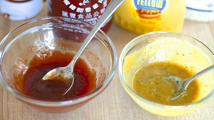 Step2To make condiments, combine ketchup with sriracha and half the honey. Combine mustards with the remaining honey and a pinch of jalapeno powder. Place in refrigerator until ready to use.