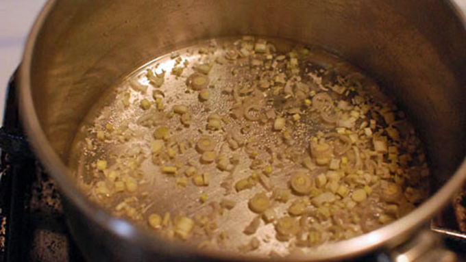 Step7For the Dressing, prepare the lemongrass. Remove the stringy woody layers until you get the tender center. Chop the lemongrass into small pieces. Chop the chiles into thin rounds. Bring the water to a simmer and add the lemongrass sugar and chiles. Let this sit for 15 minutes. Finally, add the fish sauce.