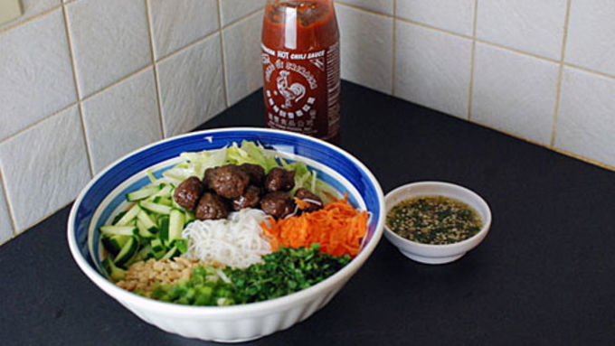 - Growing up as a somewhat picky eater, I really missed out on some amazing food that was right under my nose. I lived down the street from one of the largest Vietnamese communities in New England, but I didn't have my first taste of Vietnamese food until about a year ago! Now whenever I am visiting home, my sister and I try and stop in to one of the local restaurants for some Vietnamese delights. Most people go right to Pho, a hot soup that is the favorite Vietnamese option for many, but I always search the Bun section of the menu for cold noodles and exotic grilled meats. This Vietnamese Bun recipe looks daunting, with lots of ingredients and writing, but it is actually a fairly quick and easy dish and makes for an amazing weekend lunch. The main work is cooking the sweet and savory meatballs, known as Xiu Mai in Vietnamese, and as Vietnameatballs by me.