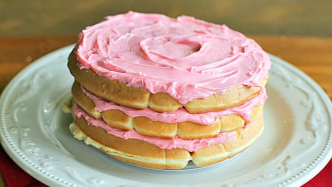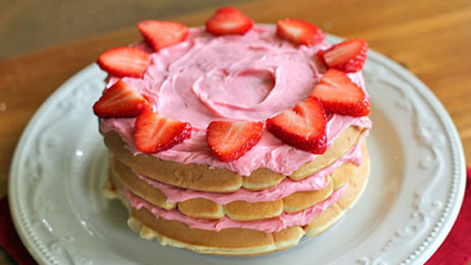 Step5Place a large waffle on serving plate. Spread some frosting on top of the waffle and add another large waffle. Repeat this until you have your desired height. I added a layer of strawberries here but you can do whatever you like. I then added 2 more large waffles with frosting in between.