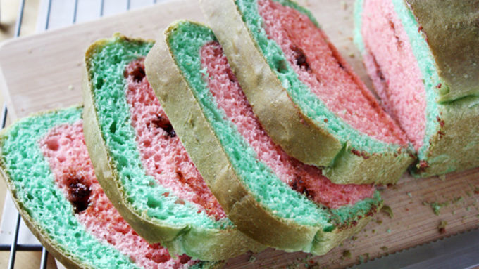 - What if I told you it’s possible to have watermelon, PB & J sandwiches, French toast, even bread pudding all in ONE RECIPE? Believe it, folks. The revolution is here with this Watermelon-Shaped Chocolate Chip Bread. Dun dun dun… Before we go any further, let’s take a look at this recipe. Is it watermelon? Is it bread? It’s BOTH, people. The magic of a little creativity and food coloring results in a chocolate chip-studded sandwich loaf that tastes like bread but looks like a watermelon. It’s madness! And it makes me feel like Willy Wonka. What is the most awesome of all the awesomeness in this recipe is that it’s super easy to make a sandwich loaf look like a slice of watermelon. And the result is a fun-to-look-at, yummy-to-eat bread that’s perfect for chocolatey peanut butter and jelly sandwiches, French toast, bread pudding: the list goes on. You can bring it to a picnic or pack it in kids’ lunches (OK, and your lunch, too) for a surprise treat. Here’s how to make the magic happen! Come with me, and you’ll be, in a world of pure imagination! Bake it up, let cool and slice to reveal the surprise! Willy Wonka would be proud.